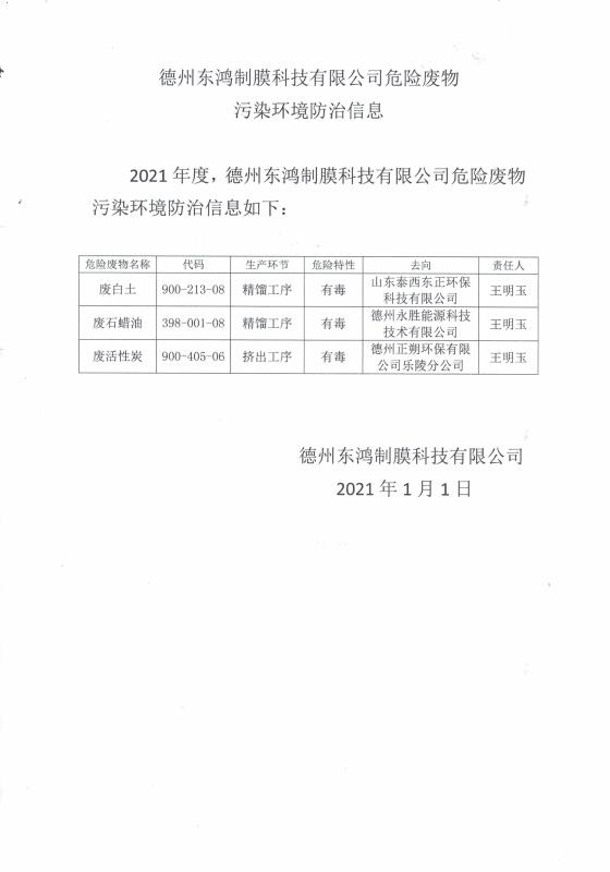 德州东鸿制膜科技有限公司危险废物污染环境防治信息