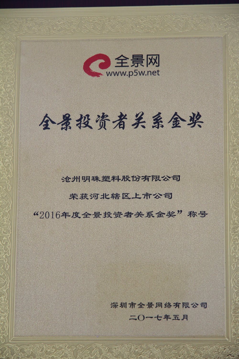 2017年5月16日,在由中国证券监督管理委员会河北监管局联合河北省上市公司协会和深圳市全景网络有限公司举办的“河北辖区上市公司2017年度投资者集体接待日”活动中,首届全景投资者关系评选结果揭晓,该奖项的设立旨在奖励在投资者关系管理工作中表现突出的上市公司。沧州明珠在河北辖区54家上市公司中脱颗而出,荣获“2016年度全景投资者关系金奖”称号。该奖项的获得是对公司2016年度在投资者关系管理、信息披露、投资者日常沟通互动及权益保护等方面工作的肯定。在今后的工作中,公司将继续加强投资者关系管理工作、提高信息披露质量,切实保护广大投资者的合法权益。